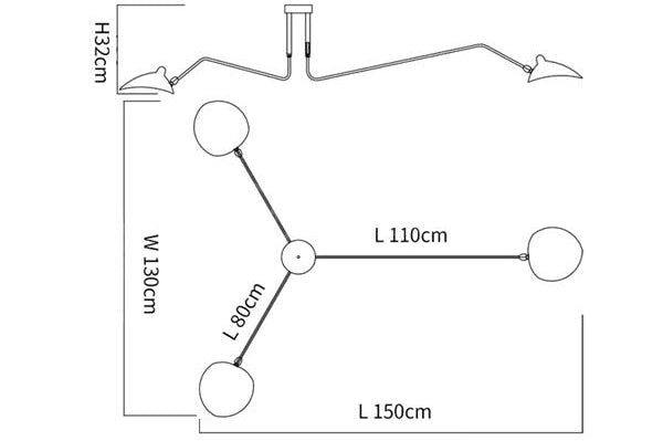 The Three Arm Ceiling Lamp (1958) is a suspended interpretation of his original Three Arm Floor Lamp, preserving the dynamic, sculptural aesthetic of the original. All of his lighting solutions embody the designer's signature characteristics: the manner in which the arms are affixed to the diffuser, the washer and six-sided screw hardware, the shape of the reflector, and the delicate lines of the steel tubes.